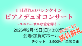 今後の出演予定 2026.02.15 1日遅れのバレンタイン ピアノデュオコンサート