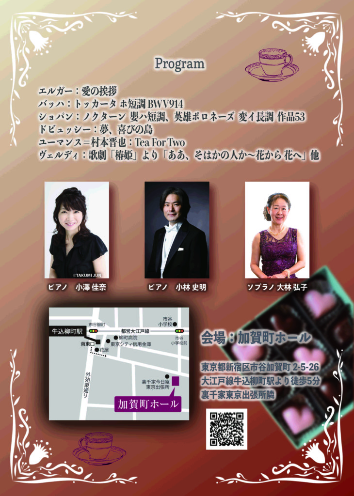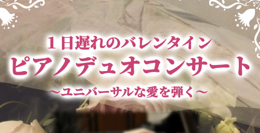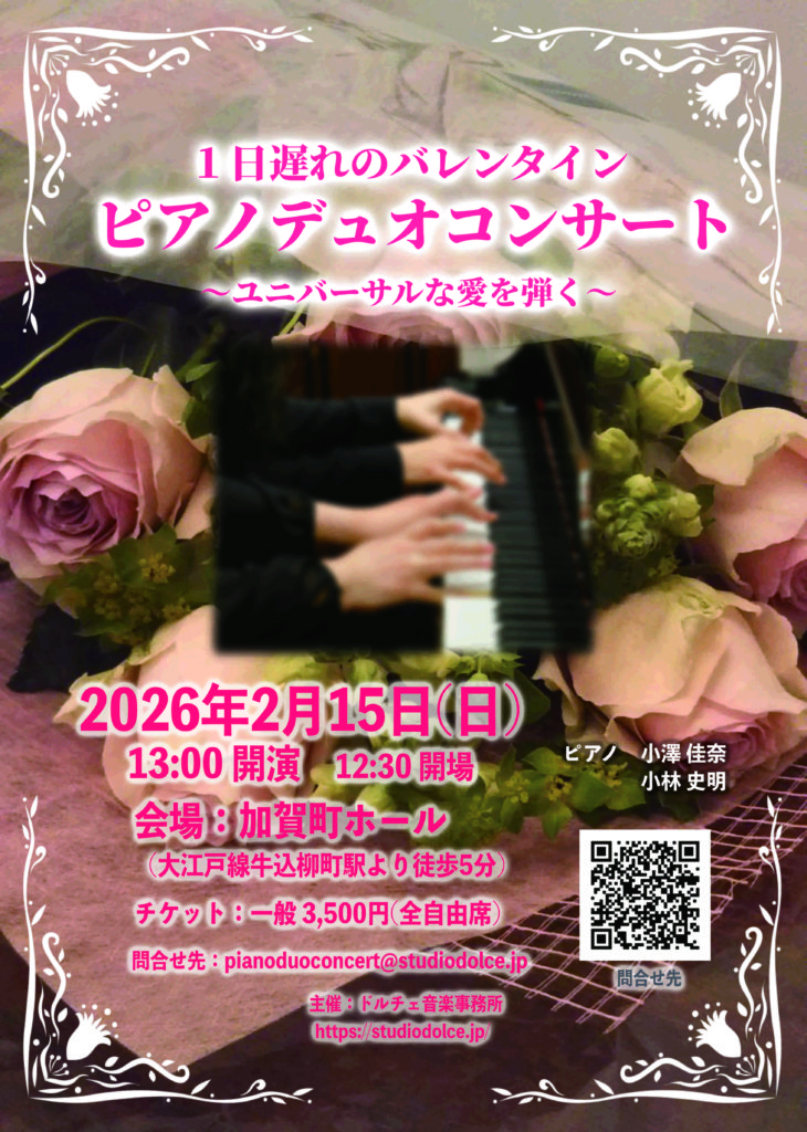 1日遅れのバレンタイン ピアノデュオコンサート 今後の出演予定 2025.12.292025.12.30 2026年2月15日(日) 13:00開演 会場:加賀町ホール問合せ先:pianoduoconcert@studiodolce.jp